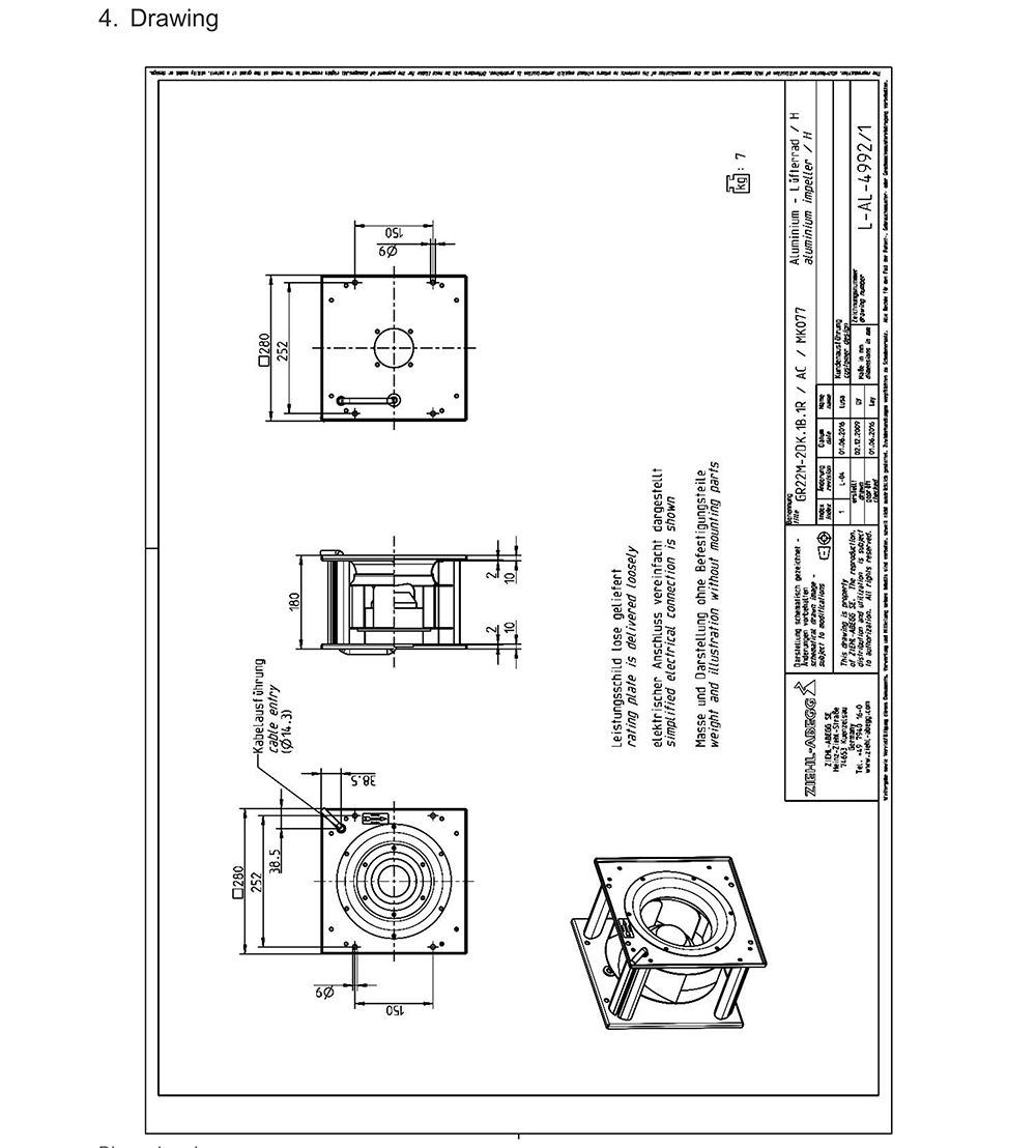 ZIEHL-ABEGG GR22M-2DK.1B.1R 153297 Centrifugal fan 190W 2740RPM 230VAC
