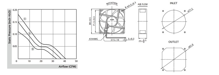 SUNON EEF80252S2-1000U-A99 Fan, Axial, 24VDC,80*80*25mm,37CFM,1.01W,2900RPM,30dB