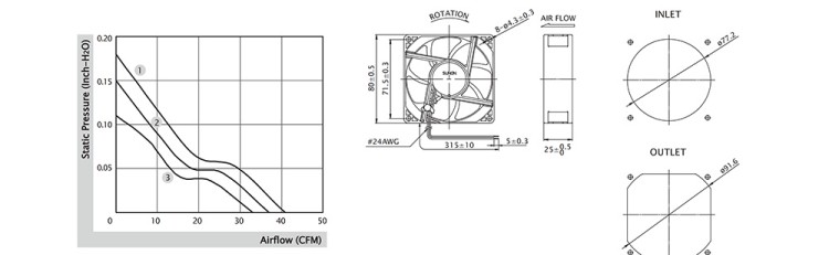 SUNON EF80251S1-1000U-A99 Fan, Axial, 12VDC,80*80*25mm,41CFM,1.44W,3200RPM,33dB