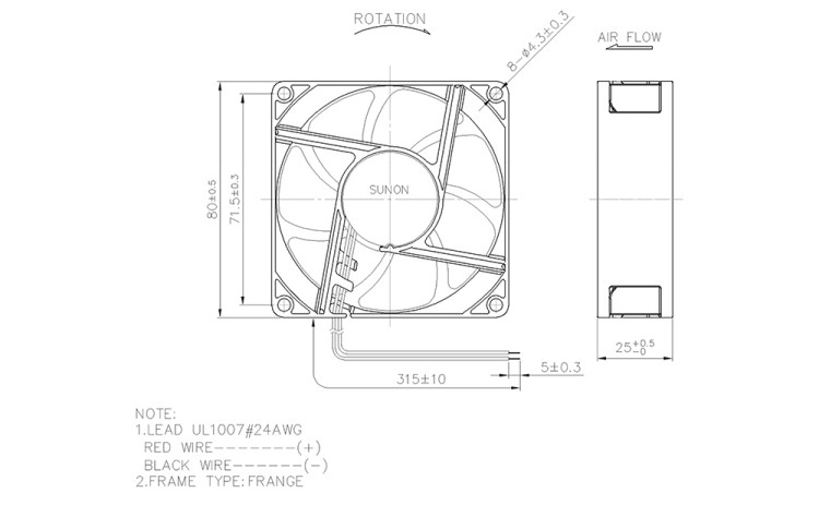 SUNON EF80252BX-1000U-A99 Fan, Axial, 24VDC,80*80*25mm,45CFM,1.97W,3600RPM,36.1dB
