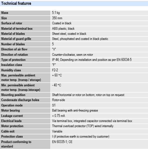 The axial fan is dynamically balanced in two planes to DIN ISO 1940
